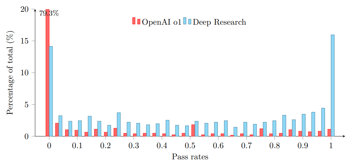 - Good distribution of pass rates: Based on the success rate of Deep Research agent on the benchmark, the questions have a well-balanced distribution of pass rates except for the fat tails (0% pass rate in 14%, 100% pass rate in 16%).