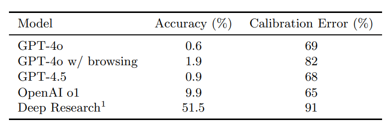 - Calibration analysis: Models that had browsing capabilities (GPT-4o with browsing, Deep Research) were found to struggle more with confidence calibration and often fail to convey uncertainty accurately.