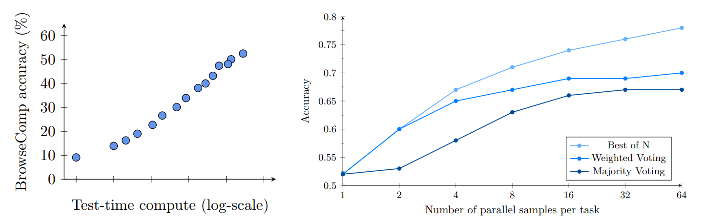 - Scaling test-time compute Accuracy scales smoothly with test-time browsing effort. Trying each problem multiple times and aggregating them also improves accuracy significantly.