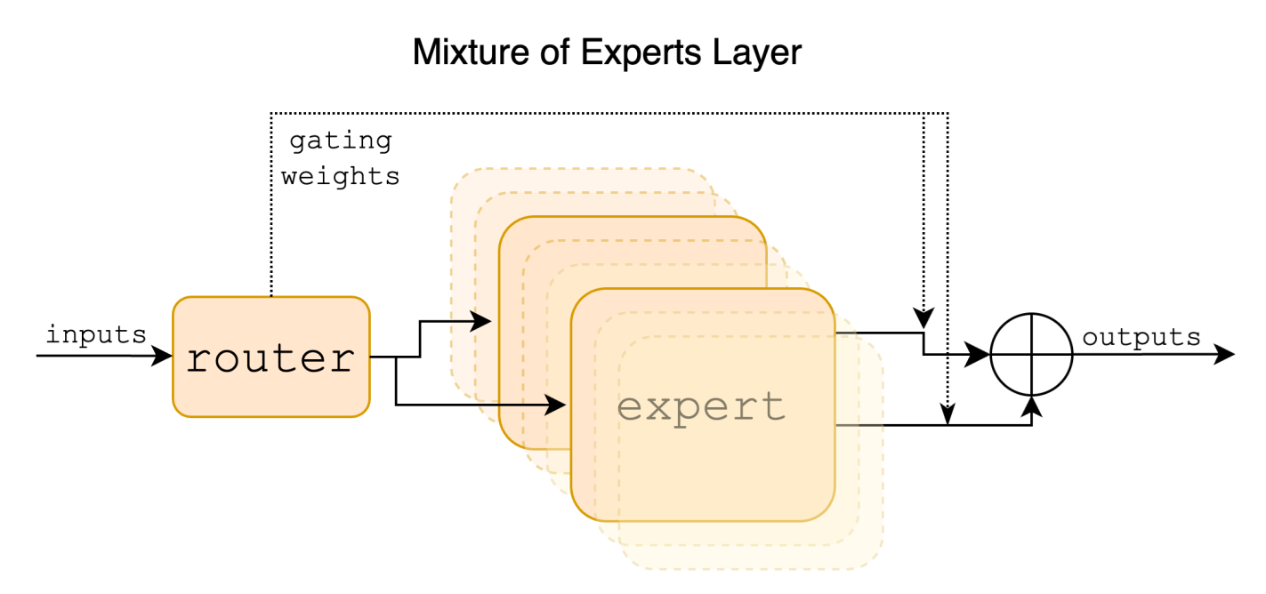 - Gating Network: The logits of the top-2 experts are passed through softmax to compute the weights.